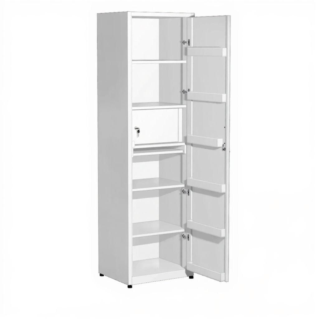 • Шкаф односекционный, наполение: 1 дверка металл, ручка, замок. На двери расположены 6 металлических лотков для медикаментов.