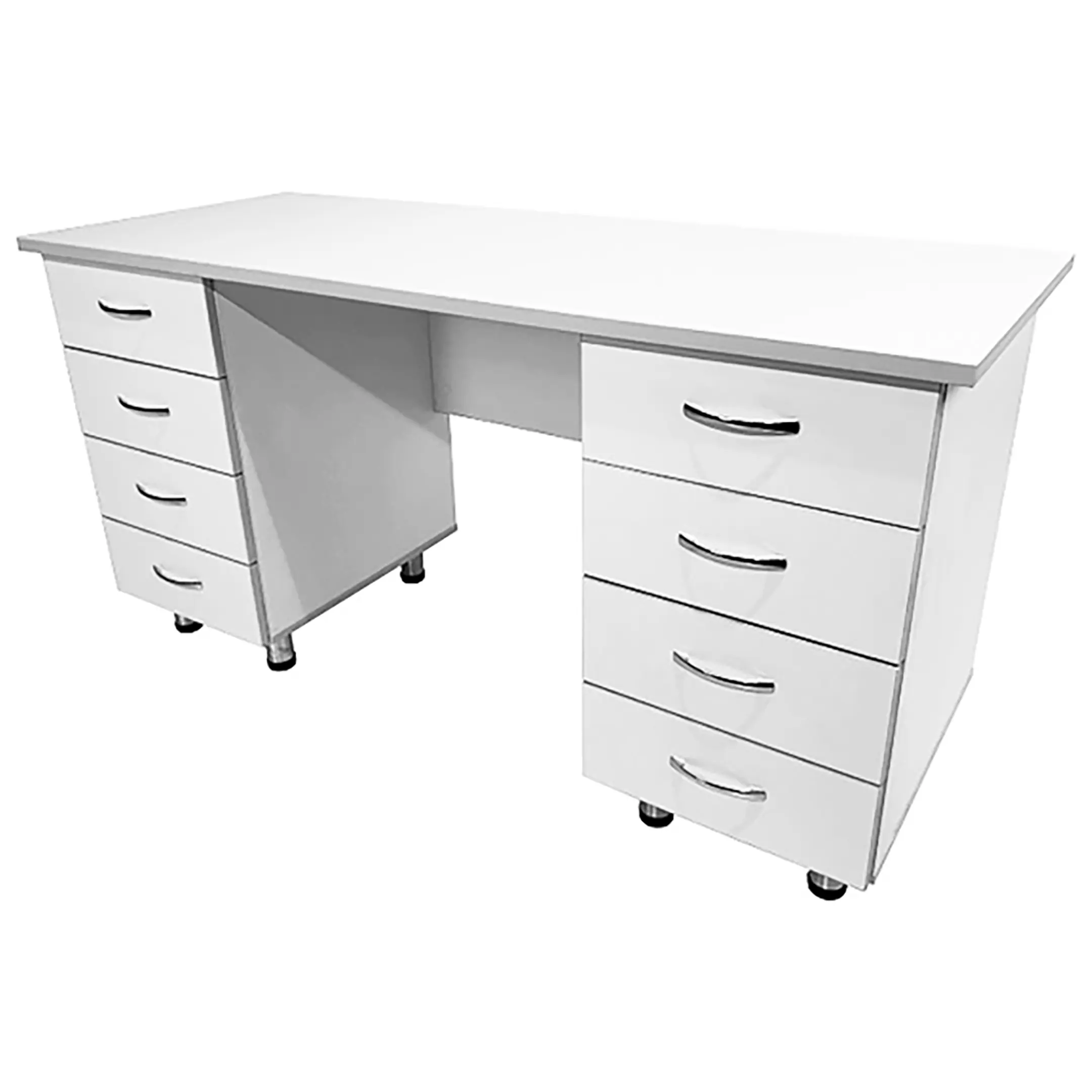 • Ключевая особенность данной модели - наличие двух боковых тумб, каждая из которых оснащена четырьмя выдвижными ящиками. Это предоставляет удобное и организованное хранение документов, инструментов и других необходимых материалов. Сочетание белого цвета ЛДСП с светло-серой кромкой создает стильный и современный внешний вид стола.