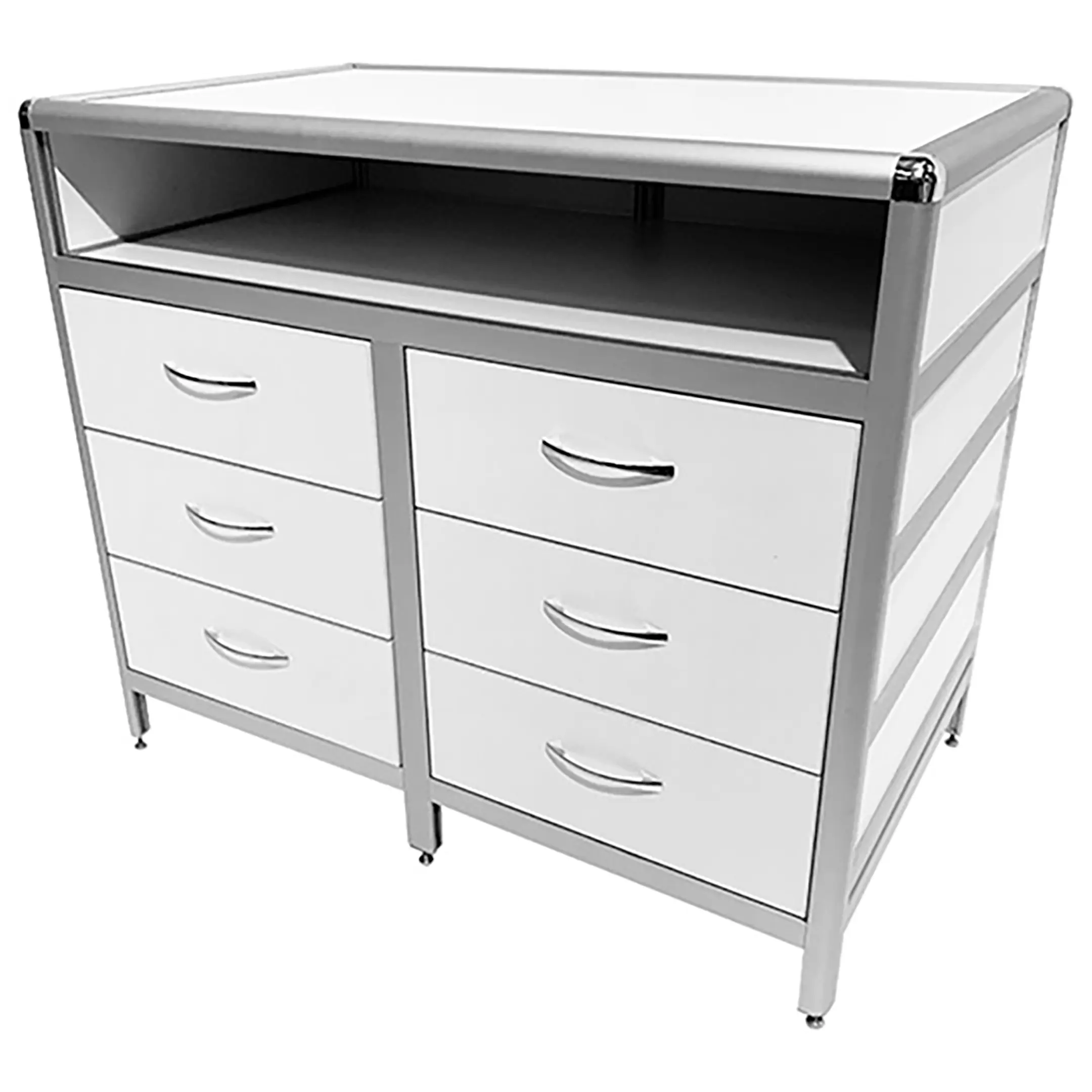 Стол-тумба лабораторная MED 12.013al (белый) — это функциональное решение для хранения лабораторного инвентаря и оборудования в лабораториях и медицинских учреждениях. Модель оснащена просторной нишей под столешницей (940х540х139 мм) и двумя вертикальными рядами выдвижных ящиков (всего 6 штук) размером 434х70х406 мм. Каркас выполнен из алюминиевого профиля, столешница из ЛДСП толщиной 16 мм.