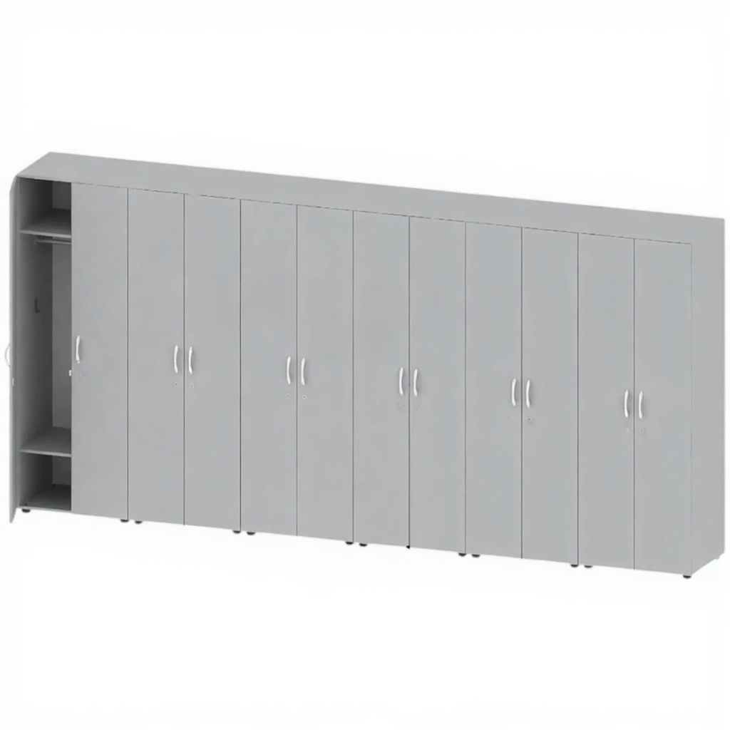 - Надежное запирание — каждая дверца оснащена врезным замком с ключом для сохранности личных вещей.