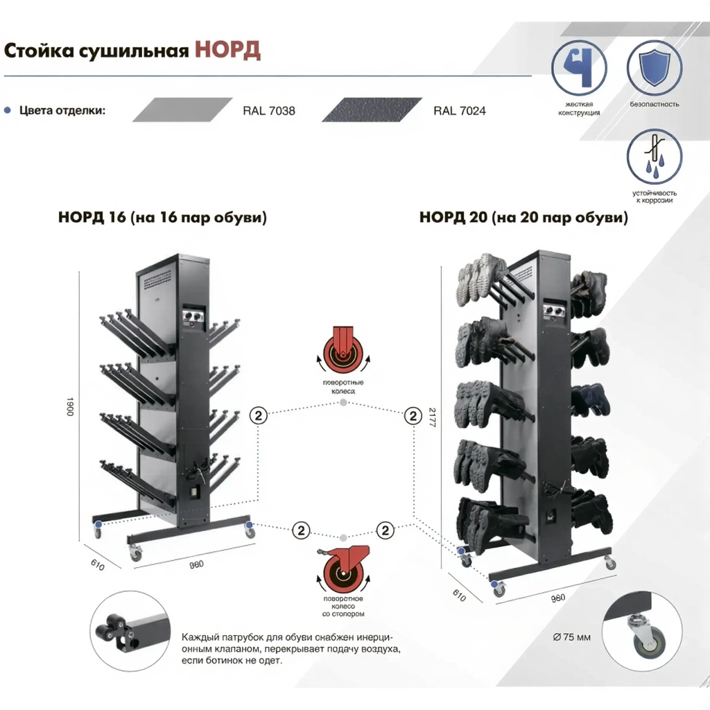 - Универсальность и удобство использования — модель подходит для различных типов помещений и может быть легко установлена в раздевалках, коридорах или специальных сушильных зонах. Удобная конструкция обеспечивает легкий доступ к обуви.