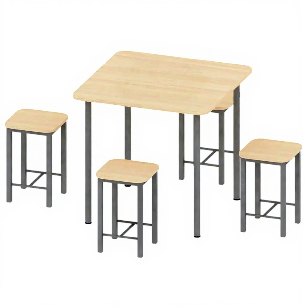 - Полный комплект для столовой — стол и четыре табурета в одном наборе.