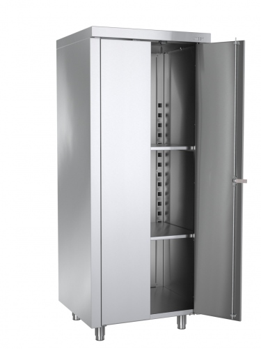 Шкаф закрытый кухонный ШЗК имеет сборную бескаркасную конструкцию. Все элементы шкафа, кроме дна и задней стенки, изготовлены из нержавеющей стали AISI 430 толщиной 0,8 мм. Дно и задняя стенка изготовлены из оцинкованной стали. Внутри шкафа расположены две полки. Конструкция шкафа позволяет изменять высоту полок с шагом 100 мм. Шкаф оснащен двумя распашными дверями с замком. Ножки шкафа изготовлены из нержавеющей стали, имеют пластиковую опорную часть и диапазон регулировки +/- 20 мм.