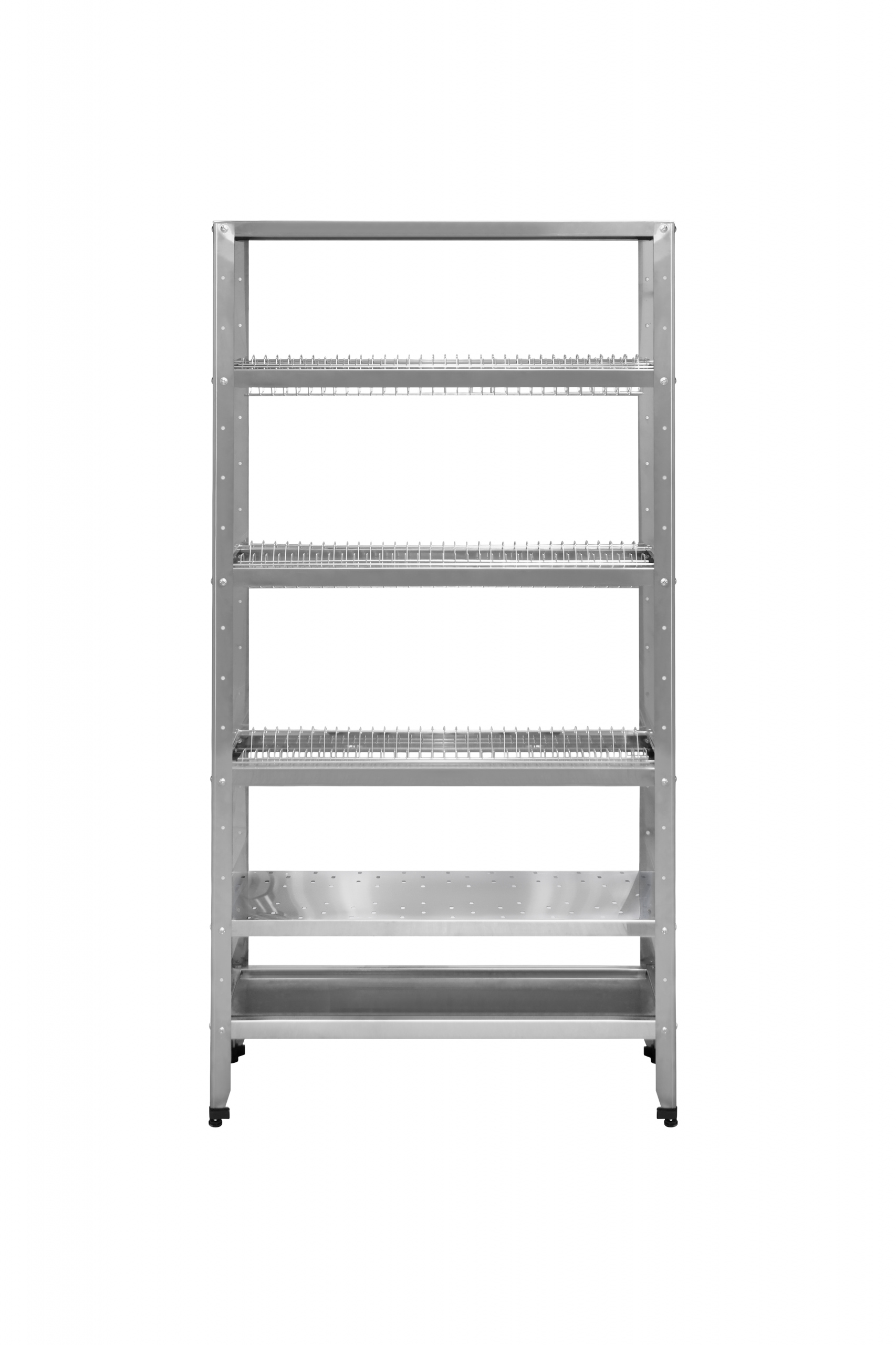 5 полок (сверху-вниз: верхняя сплошная, 3 полки для посуды, перф.полка для сушки стаканов) + поддон-полка с углублением для сбора стекающей воды.