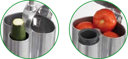 Насадка-овощерезка используется для нарезки сырых овощей, а также позволяет быстро приготовить разнообразные салаты, винегреты и выполнить любую форму нарезки, необходимую для приготовления супов, гарниров и сладких блюд. Овощерезка имеет 2 загрузочных отверстия: большая воронка площадью 139 см² для крупных овощей (картошка, свекла, капуста) и круглая воронка для овощей вытянутой формы диаметром 58 мм (огурцы, морковь, перец и т.д)