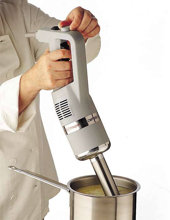 Миксер ROBOT COUPE CMP 300 Combi оснащен системой саморегулирования скорости. Заданная скорость фиксируется и остается постоянной. Данная модель миксера имеет сменные насадки. Венчик позволяет взбивать и перемешивать продукт, а блендер интенсивно измельчать его. Поэтому он отлично подойдет для приготовления различных блюд, теста для выпечки, а также для взбивания белков, сливок, кремов, приготовления муссов, суфле и творожных масс с густой консистенцией. Кроме того, функция постепенного ускорения вращения ножа позволяет выбрать оптимальный режим, предотвращая разбрызгивание продукта.