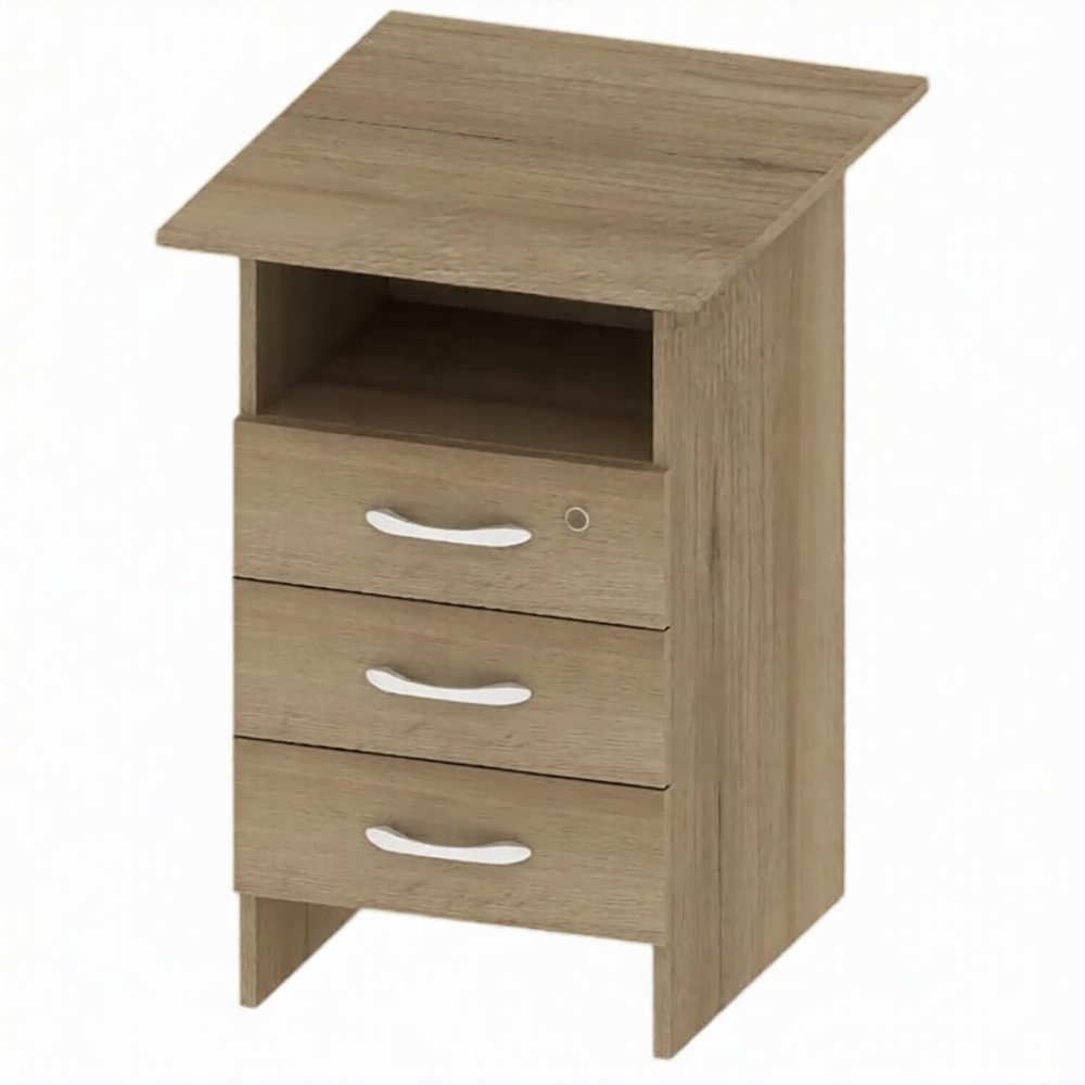 • Тумба с полкой и тремя выкатными ящиками. Верхний ящик закрывается на ключ.