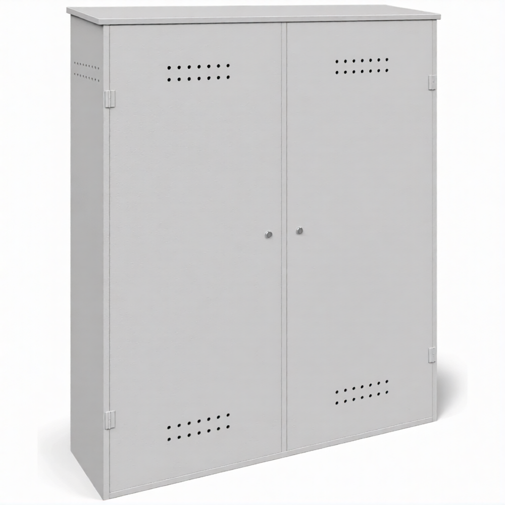- Надежная защита от хищений и вандализма — усиленная сварная конструкция, массивные петли и возможность установки серьезных запорных устройств (навесные замки повышенной секретности, врезные замки) делают этот шкаф настоящим сейфом для газовых баллонов, эффективно защищающим дорогостоящее имущество даже на неохраняемых территориях.