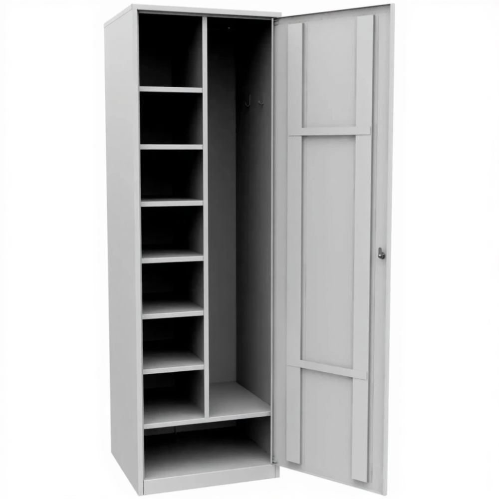 • Шкаф для сменной одежды и инвентаря одностворчатый металлический комплектуется 6-ю полками, отделением для обуви, крючками для одежды.