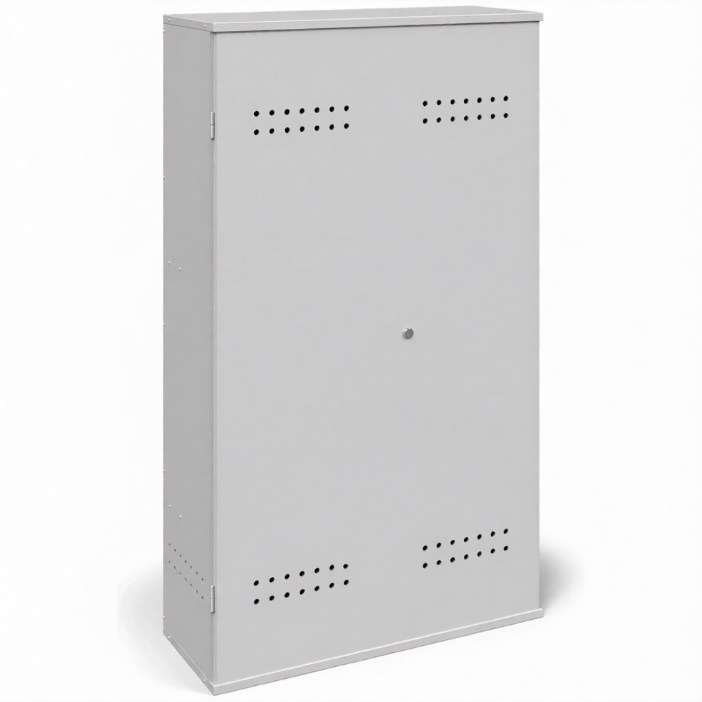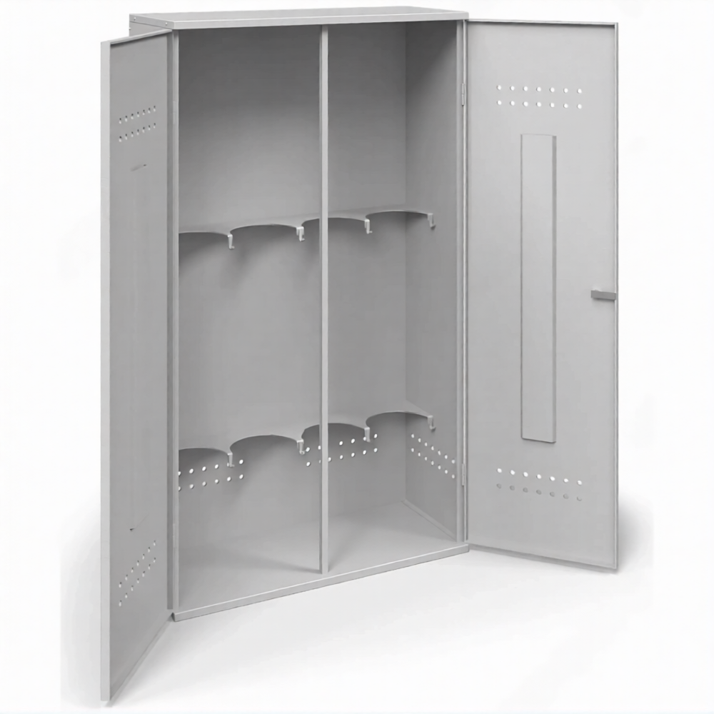 - Надежная защита от внешних воздействий и хищений — несмотря на разборную конструкцию, собранный шкаф представляет собой прочную и устойчивую конструкцию. Наличие запирающихся дверей на замок защищает баллоны от кражи, несанкционированного доступа, а также от пыли, грязи и атмосферных осадков при установке под навесом.