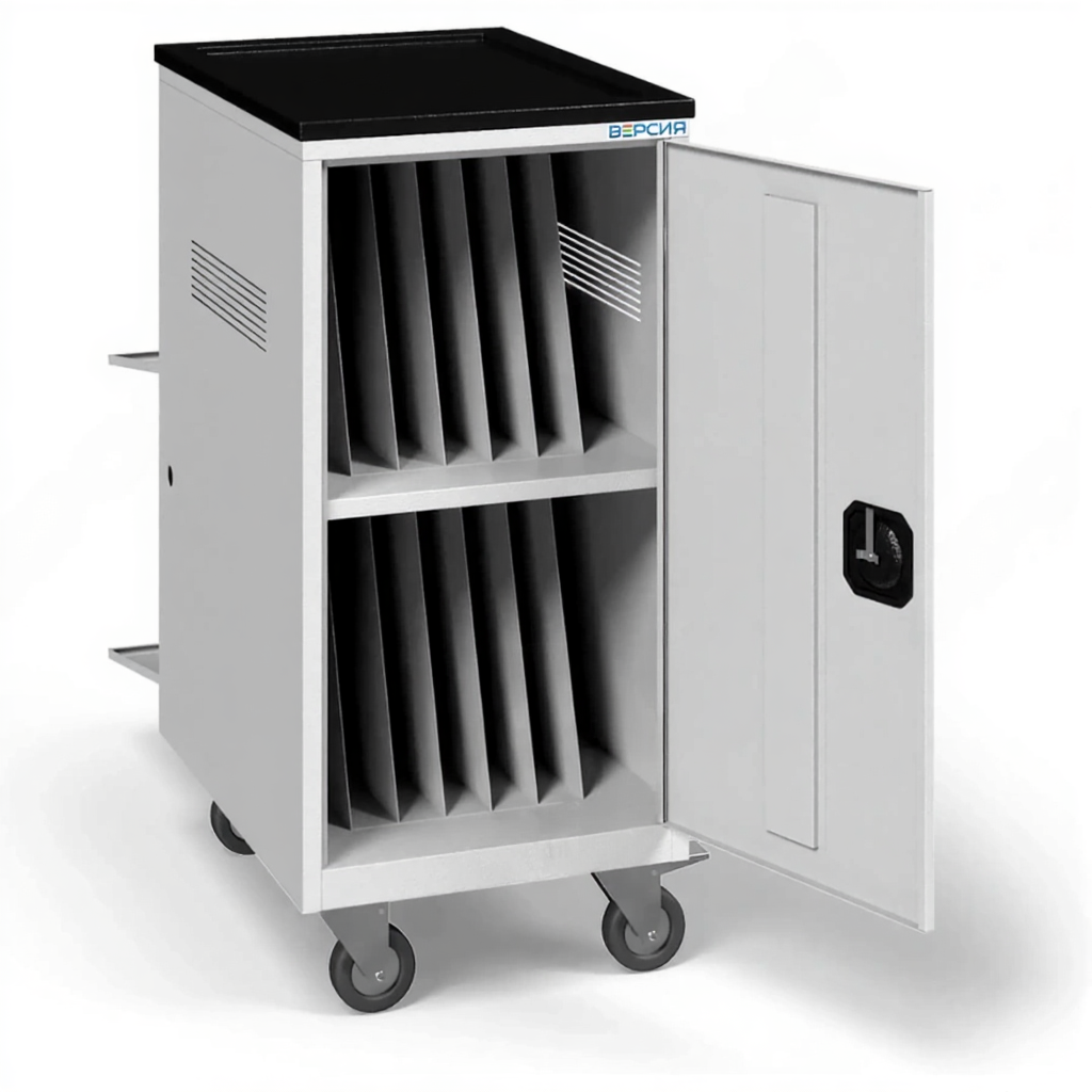- Надежная защита и порядок — прочный корпус с замком защищает технику от кражи и несанкционированного доступа. Каждый ноутбук имеет свое индивидуальное место, что предотвращает повреждения и упрощает учет.