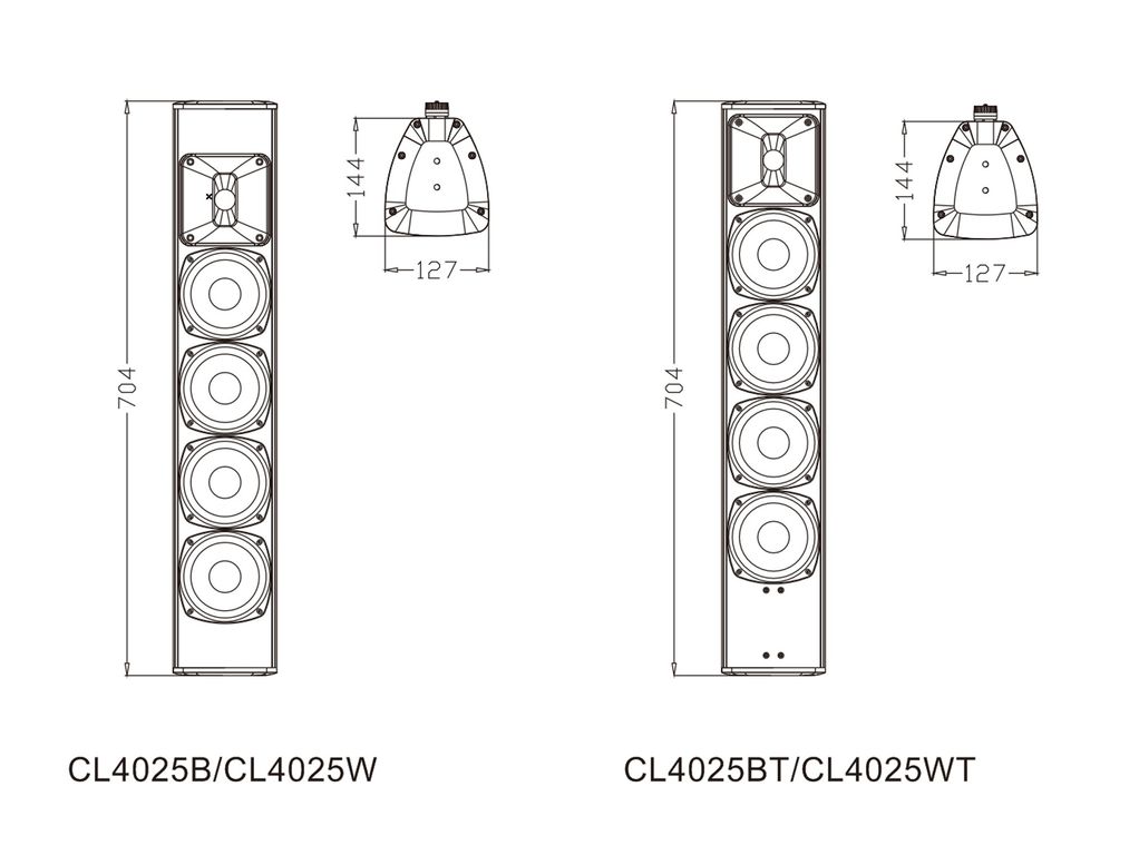Серия CL4025 представляет собой акустическую систему колонного типа с различными цветами и функциями. Продукт соответствует стандарту IP56. Звук мягкий и сбалансированный. Корпус изготовлен из алюминиевого сплава. Буквы B и W после модели обозначают черный и белый цвет соответственно, а буква T представляет собой конфигурацию с трансформатором.